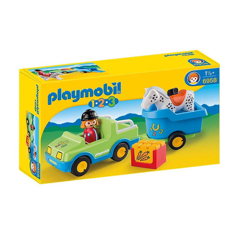 PLAYMOBIL to synonim kreatywnej zabawy - wcielania się w rolę; to jakość i bezpieczeństwo na najwyższym poziomie. Klocki te niezmiennie zalicza się do ulubionych zabawek dzieci. Zaufanie rodziców do marki bazuje także na wiedzy o wysokiej jakości produktu "Made in Europa". Poszczególne elementy zestawów Playmobil można łączyć z innymi, tworząc nowe i niepowtarzalne historie. PLAYMOBIL 1-2-3 Samochód z przyczepą dla konia. Wiek 18 miesięcy+