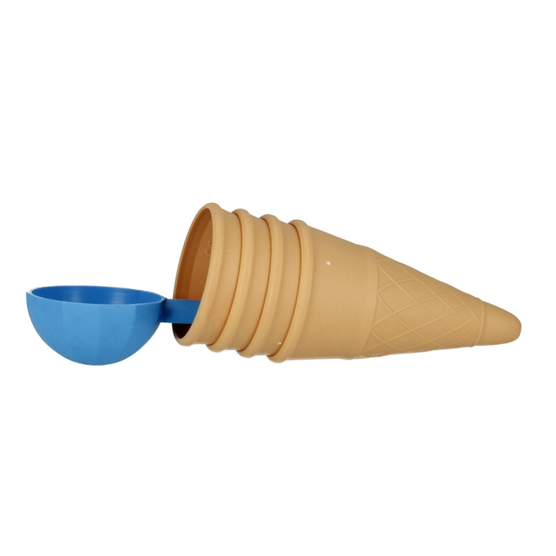 Zabawki są w kształcie stożka, kubeczka do loda i łyżki, dzieciaki będą miały frajdę napełniając piaskiem takie foremki.