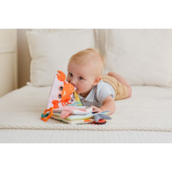 Pod wodą znajduje się magiczny świat, pełen kolorowych rybek i ciekawych stworzeń! Razem z materiałową książeczką poznaj ich wygląd, nazwę w języku polskim i angielskim, a także stymuluj zmysły, odkrywając wystające elementy każdego ze zwierzątek. Książeczka wykonana została z materiałów o zróżnicowanych fakturach i kolorach, dzięki czemu najmłodsi, poprzez eksplorowanie każdej z barwnych stron, mogą rozwijać swoje zdolności poznawcze.