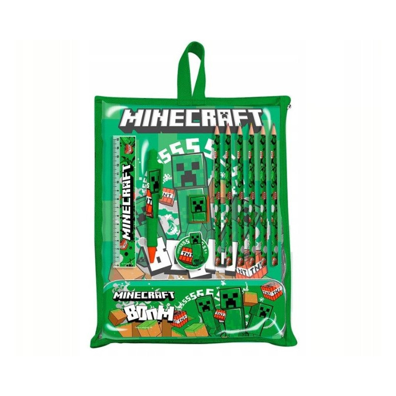 Zestaw z motywem Minecraft, idealny produkt dla dzieciaków, uczniów. Zawiera artykuły piśmiennicze oraz akcesoria szkolne.