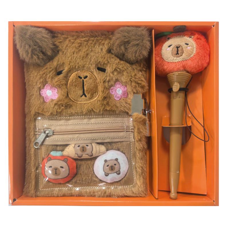 Milutki pamiętnik, zawiera 40 kartek w linie, ma twardą, pluszową oprawę z wizerunkiem Kapibary i jest zamykany na kłódkę. Posiada również zasuwaną kieszonkę, w której umieszczone są małe, pluszowe maskotki.