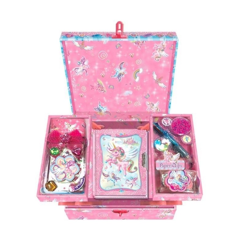 Zestaw zapakowany w ozdobne pudełko (szkatułkę) z 2 półeczkami, które można rozłożyć na boki, a pod nimi schować pamiętnik. Szkatułkę wykonano ze wzmocnionej tektury. Wierzch szkatułki ozdobiony jest przesypującymi się kryształkami w okienku.