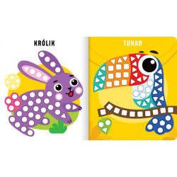 Mozaiki naklejki. Aktywizująca książeczka dla małych dzieci. Naklejam z pieskiem” to prawdziwa gratka dla fanów naklejania. W tej aktywizującej książeczce zadanie polega na tworzeniu z naklejek prostych mozaik. To doskonale ćwiczenie dla małych rączek umilą sympatyczni mieszkańcy sawanny, lasu, głębin morskich, dżungli, łąki, gospodarstwa i domowi pupile. Zapraszamy na spotkanie z motylkiem, rybkami, pieskiem, słonikiem i zebrą, tygrysem, ślimakami, królikiem, tukanem, delfinem, chomikiem oraz małpką. Dzieci uzupełniają obrazki dwunastu uroczych zwierzątek geometrycznymi naklejkami. Naklejkowe trójkąciki, kółeczka i kwadraciki należy wkleić zarówno na postacie zwierząt, jak i elementy krajobrazu. „Naklejam z pieskiem” to pozycja odpowiednia do samodzielnej zabawy. Praca z książeczką jest bardzo intuicyjna, a dziecko nie potrzebuje instrukcji dorosłego. Dzięki tej kształcącej zabawie dziecko wycisza się, ćwiczy precyzję, koncentrację, a także uczy się cierpliwości i rozwija wyobraźnię. Naklejam z pieskiem– pierwsze mozaiki twojego dziecka.