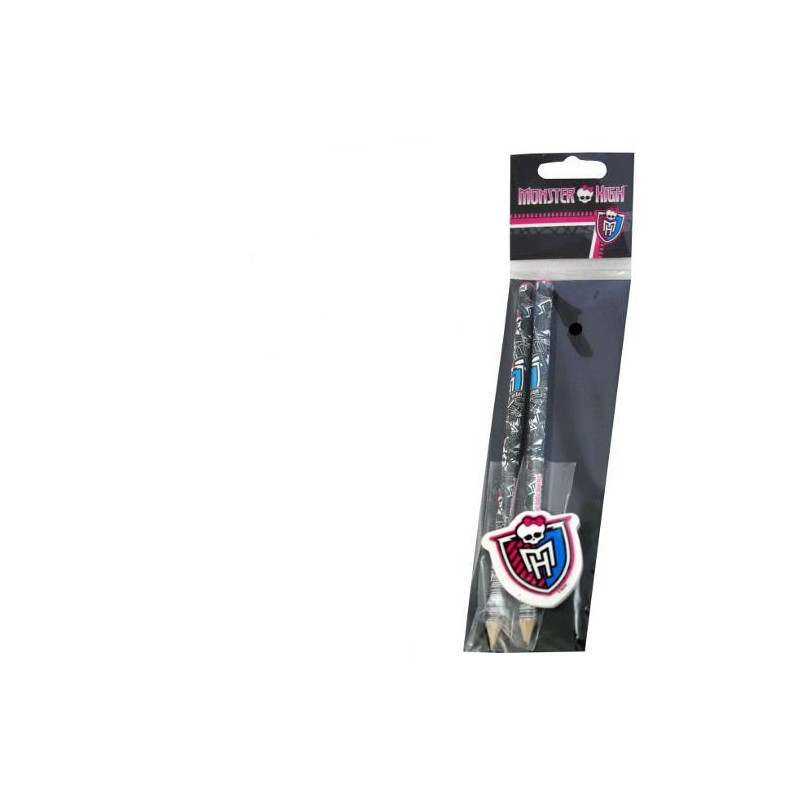 Zestaw szkolny z serii Monster High firmy Euromic. Zestaw szkolny zawierający dwa ołówki, linijkę i gumkę do mazania z nadrukiem z serii Monster High.