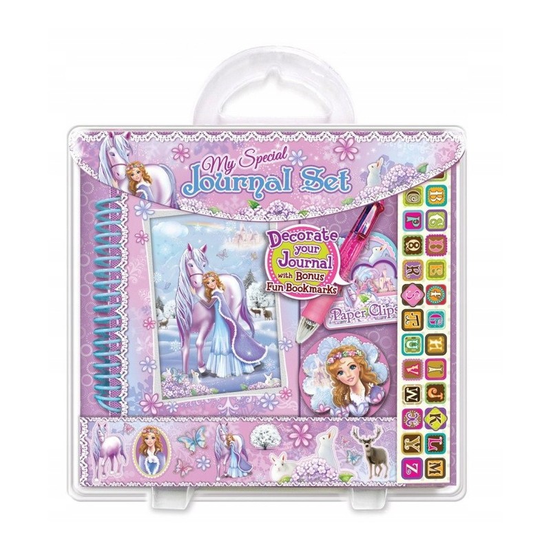 Mały pamiętnik z kolorowymi kartkami zamykany na kluczyk, długopis w 4 kolorach, naklejki 3 D, kolorowe, papierowe spinacze, naklejki z literami alfabetu, naklejki z obrazkami. Zestaw zapakowany jest w przezroczyste opakowanie z uchwytem.