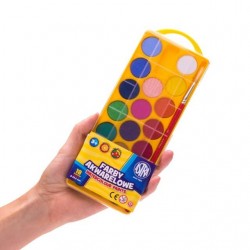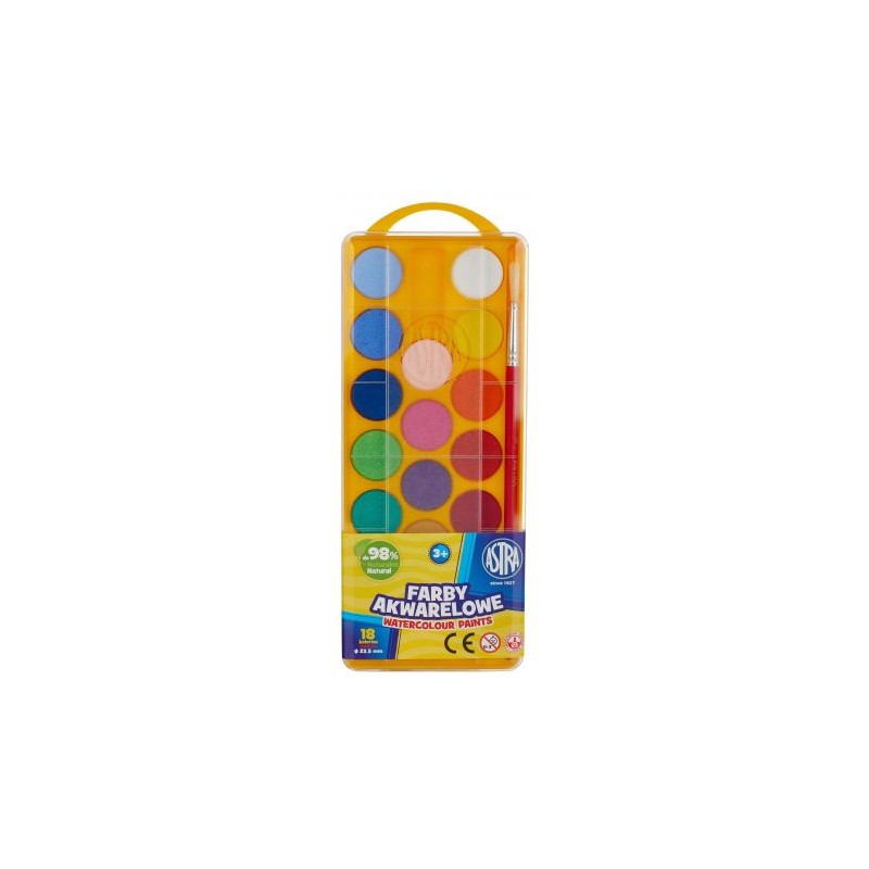 Farby akwarelowe to farby wodne służące do malowania na papierze. Mają one postać suchych guziczków, z których po zwilżeniu wodą niemal natychmiast uzyskuje się gotowe do użycia farby. Opakowanie zawiera 18 kolorów najczęściej używanych.