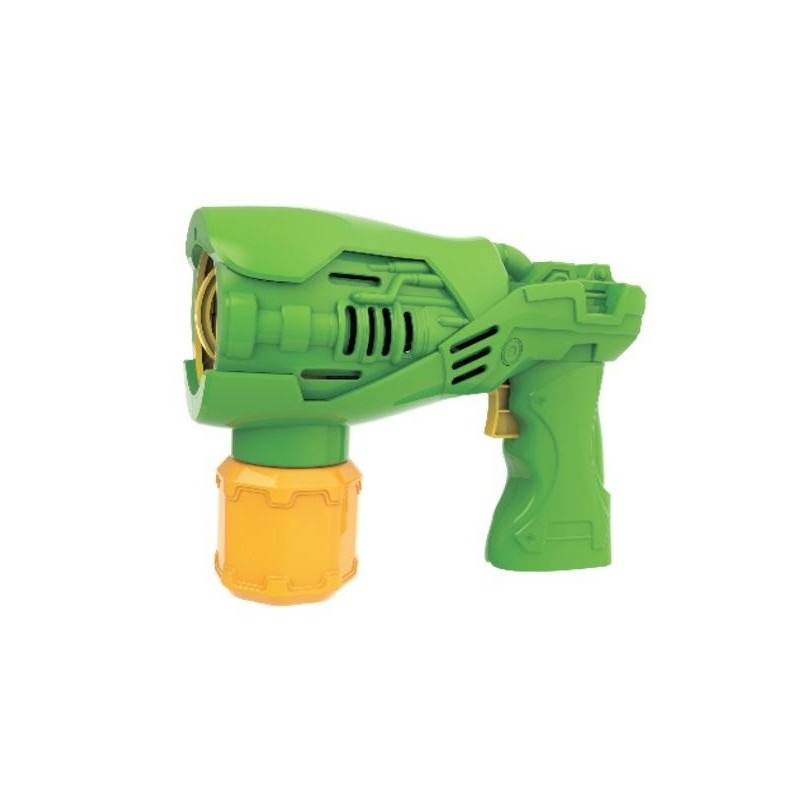 wkręć butelkę z płynem do zabawki, a następnie naciśnij spust wyrzutni, a wystrzeli z niej strumień baniek. Do zestawu dołączony jest płyn do baniek.