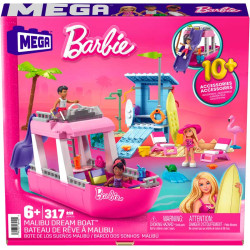 Zbuduj Wymarzoną łódź Malibu i dołącz do Barbie oraz jej przyjaciół podczas radosnych plażowych przygód. Ta wymarzona łódź do zbudowania ma leżaki, telewizor, miejsce do siedzenia, zjeżdżalnię i pokład do opalania. Górę łódki można zdjąć, aby łatwo bawić się na głównym pokładzie. Możesz też zbudować wieżę ratownika z prysznicem na świeżym powietrzu i deską do śmigania po falach. Elementy są kompatybilne ze wszystkimi zestawami konstrukcyjnymi Mega i Barbie oraz z klockami innych wiodących marek. Zabawka pobudza kreatywność i uczy rozwiązywania problemów, idealna dla konstruktorów powyżej 6 roku życia.