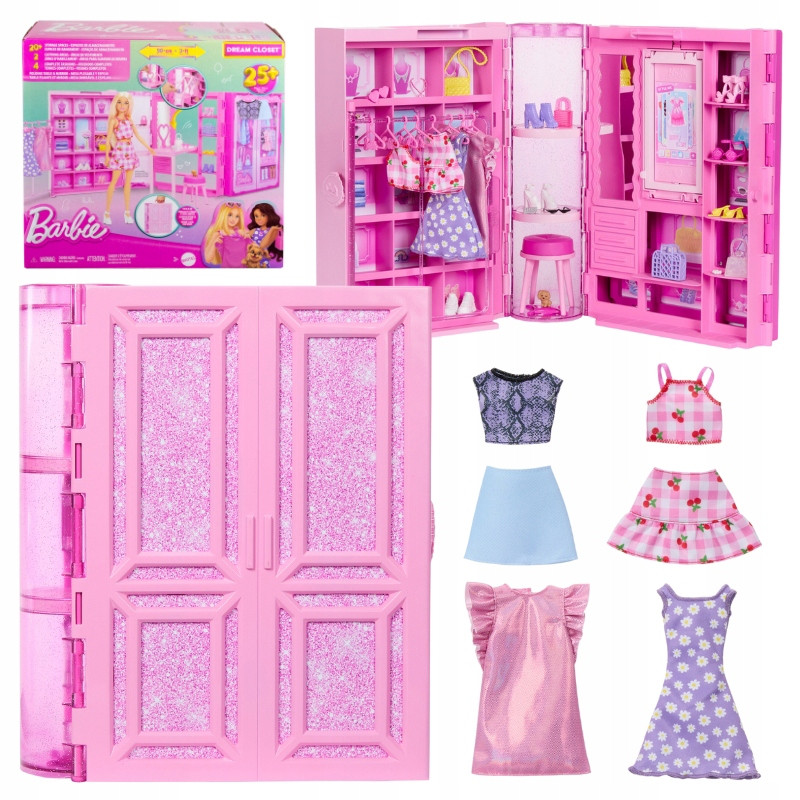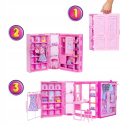 Brokatowa szafa po rozłożeniu ma 90cm szerokości, i ponad 20 miejsc do przechowywania , oraz 2poręcze do zawieszania wieszaków. Ponadto rozkładana taoletka z serduszkowym lusterkiem, dużym lustrem i półką na buciki.Zestaw zawiera 25 elementów to tworzenia róznych stylizacji, takich jak: sukienki, buciki, torebki, naszyjniki