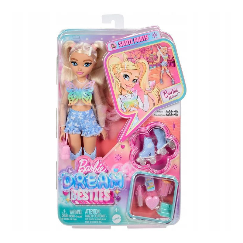 Lalka Barbie „Malibu” w nowej stylizacji inspirowanej motylkami i z uroczymi wrotkami pragnie wyruszyć ku nowej przygodzie. Barbie „Malibu” marzy o własnej firmie kosmetycznej, więc zawsze ma ze sobą tematyczne akcesoria, takie jak „błyszczyk” czy lusterko. Lalka do ustawiania w różnych pozach ma na sobie zdejmowane ubranka, w tym błyszczącą motylkową koszulkę na białej półprzezroczystej bluzce z długim rękawem, dżinsowe szorty z motywem motyla i falbanką oraz niebieskie wrotki. Jej długie blond włosy uczesane w dwie kitki i ozdobione perełkową spinką, z różowymi pasmami z efektem ombre podkreślają jej energiczną osobowość!