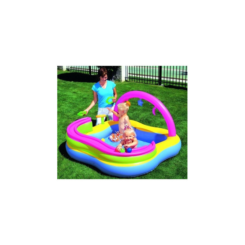 Basen dmuchany plac zabaw firmy Bestway.Plac zabaw z dmuchanym pałąkiem, grą ringo oraz dmuchaną rampą. Dodatkowo dołączono 6 piłeczek oraz 3 obręcze. Zestaw zawiera łatkę naprawczą. Pojemność 151 litrówWymiary 157 x 157 x 89 cm