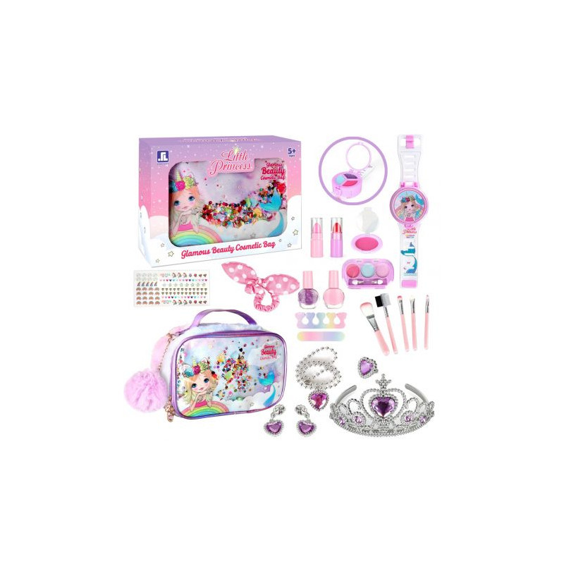 Zestaw składa się z dwóch lakierów, dwóch szminek, błyszczyku, cieni do powiek, zegarka z cieniami, naklejkę, pilniczka, separatora do malowania paznokci, gumki do włosów, pięciu pędzelków do nakładania makijażu, korony, klipsów, pierścionka i naszyjnika oraz pięknej kosmetyczki z przywieszką.