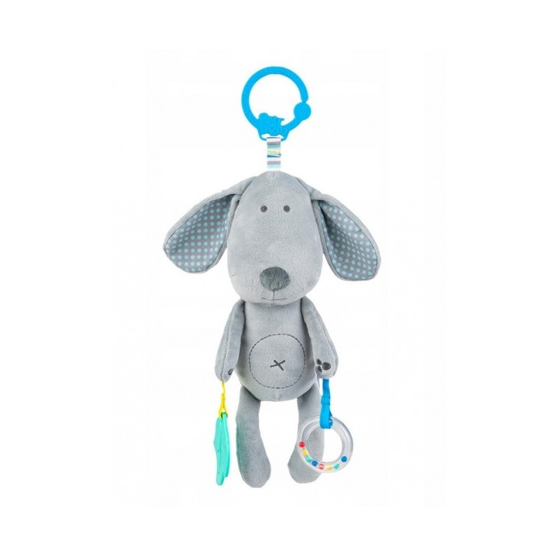 Piesek zawieszka wyposażona została w gryzaczek, który przyniesie ulgę obolałym dziąsłom ząbkującego bobasa. Zabawkę zdobi także grzechocząca obręcz z kolorowymi kuleczkami. Praktyczny uchwyt do mocowania zabawki, pozwoli przymocować ją w dowolnym miejscu, aby wszędzie mogła towarzyszyć maluchowi.