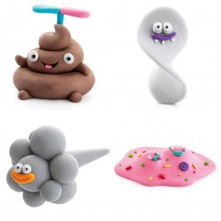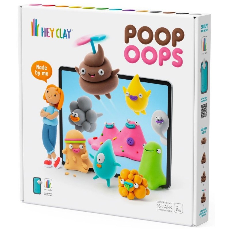 Masa plastyczna POOP OOPS z akcesoriami zawiera szesnaście puszek z miękką, kreatywną piankoliną. Trzynaście kolorów pozwala ulepić dziewięć szczególnych postaci - kupę, siku, woskowinę, wymioty, smarka, łzę, łupież, bączka i pot. Zabawni bohaterowie dnia codziennego z masy plastycznej Hey Clay oswajają dzieci z wydzielinami ludzkiego ciała. Pozwalają wyrobić otwartość na wstydliwe tematy, a rozmowę o cielesności uczynić bardziej dostępną.