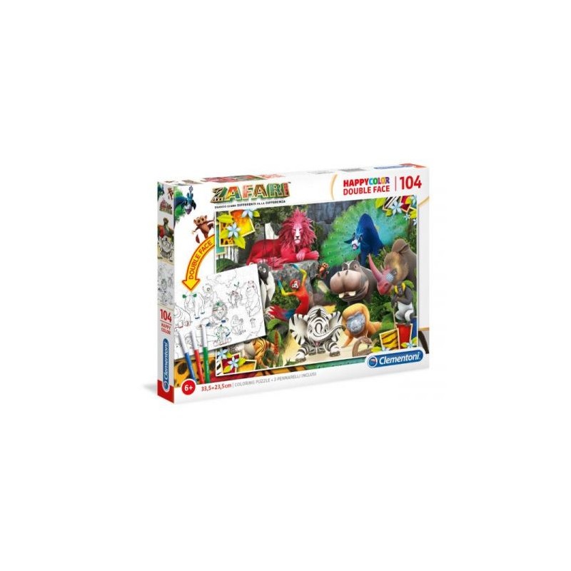 Puzzle Clementoni Supercolor Zafari. Dwustronne puzzle, które po jednej stronie mają obrazek,który można pomalować 3 pisakami dołączonymi do zestawu.