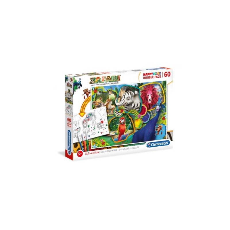 Puzzle Clementoni Supercolor Zafari. Dwustronne puzzle, które po jednej stronie mają obrazek,który można pomalować 3 pisakami dołączonymi do zestawu.