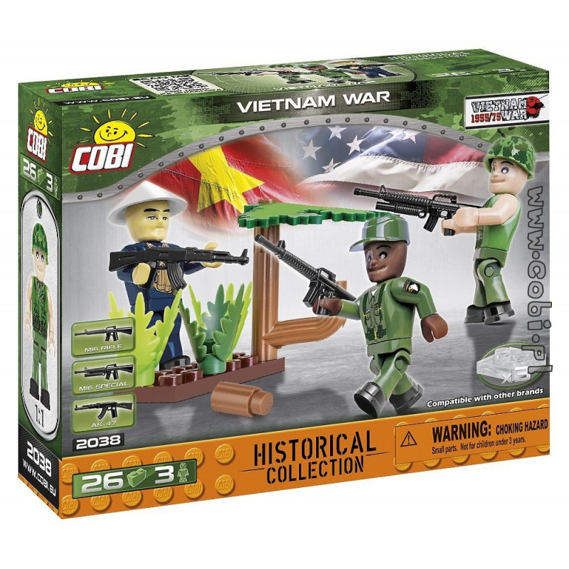 Zestaw trzech figurek, które przedstawiają żołnierzy walczących podczas konfliktu na Półwyspie Indochińskim. Każda figurka przedstawia członka innej jednostki. Żołnierz Wietkongu otrzymał nadruk z typowym mundurem oraz został wyposażony w charakterystyczny dla tego regionu słomkowy kapelusz. Uzbrojony jest w karabinek AK-47, czyli popularny kałasznikow. Żołnierz amerykańskiej 101 Dywizji Powietrzno-Desantowej oprócz odwzorowanego munduru otrzymał na ramieniu nadruk z orłem, czyli emblemat tej słynnej dywizji. Uzbrojony jest w karabin automatyczny M16. Ostatnia figurka przedstawia żołnierza Marines ubranego w założoną na gołe ciało kamizelkę kuloodporną. Na jego wyposażeniu znajduje się rewelacyjnie odwzorowany hełm amerykański z nadrukowanym realistycznym kamuflażem oraz karabin M16 w wersji z granatnikiem. Całość zestawu uzupełniają trzy transparentne podstawki do ustawienia figurek oraz klocki z elementami otoczenia, które można wykorzystać przy zabawie i budowie dioram. Dzięki różnorodnym zestawom z figurkami szybko zbudujesz swoją klockową armię! Kupując kilkukrotnie ten zestaw, z łatwością odtworzysz walki w Wietnamie i nie tylko. Modele i figurki z kolekcji Wojna w Wietnamie to świetne materiały na budowę scenek i dioram historycznych.