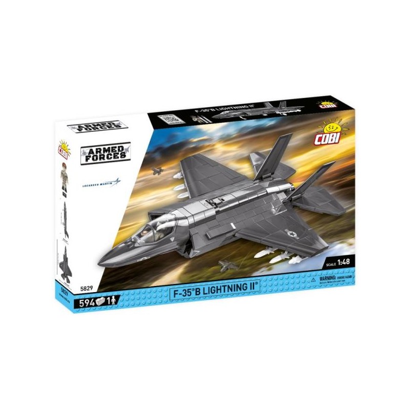 F-35?B LIGHTNING II? to jednomiejscowy, wielozadaniowy myśliwiec zaprojektowany przez korporację Lockheed Martin. F-35 w wersji B to samolot krótkiego startu i pionowego lądowania STOVL mający zastąpić dotychczas użytkowane maszyny Korpusu Piechoty Morskiej Stanów Zjednoczonych oraz te należące do brytyjskiego RAF-u i Royal Navy. Z 594 najwyższej jakości klocków konstrukcyjnych COBI wybudujesz wydany na licencji megakoncernu zbrojeniowego Lockheed Martin najnowocześniejszy na świecie wielozadaniowy myśliwiec F-35?B LIGHTNING II?. Zestaw został starannie zaprojektowany w modelarskiej skali 1:48. Specjalnie zaprojektowane na potrzeby tego zestawu klocki zostały pokryte wysokiej jakości nadrukami. Charakterystyczna kabina pilota wykonana jest w sposób bardzo realistyczny i można ją otwierać, aby mieścić w środku figurkę pilota wyposażonego w kask i maskę tlenową z wężykiem. Kupując samolot, zbudujesz również klockową podstawkę ekspozycyjną z tabliczką zawierającą nazwę zestawu! Dzięki intuicyjnej instrukcji budowa jest prosta i nie sprawi problemów mniej zaawansowanym budowniczym.