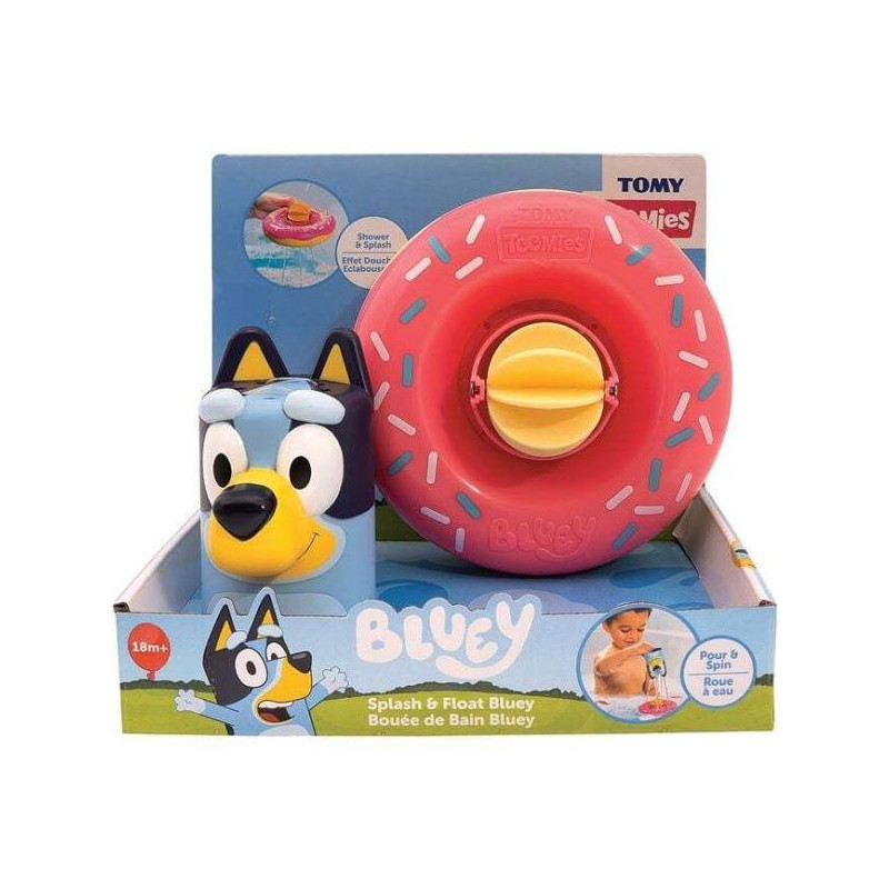 Zabawka została zaprojektowana z myślą o maluchach od 18. miesiąca życia i doskonale sprawdzi się zarówno w wannie, jak i w dziecięcym basenie. Urocza figurka Bluey unosi się na kolorowym pontonie, który skrywa obracające się koło wodne. Zestaw składa się z dwóch elementów: pływającego pierścienia z wiatrakiem wodnym oraz figurki Bluey w formie kubeczka z otworami, który można napełniać wodą i polewać koło, wprawiając je w ruch. Dolna część pontonu zawiera otwory prysznicowe – po zanurzeniu w wodzie tworzy się efektowny strumień. Zabawka nie wymaga baterii – wszystko działa dzięki aktywności dziecka. Rozwija zdolności motoryczne, wspiera naukę przyczynowo - skutkową i pomaga budować pozytywne doświadczenia związane z wodą.
