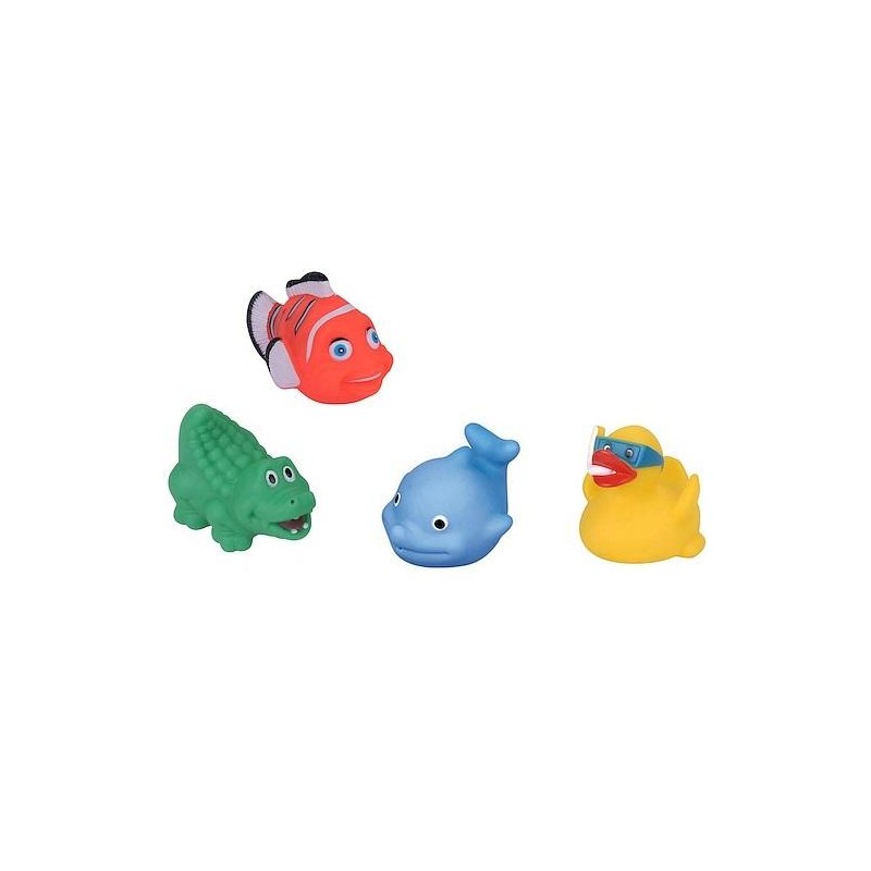 Zestaw zawiera cztery gumowe, kolorowe zwierzątka. Zabawa nie tylko w wodzie, zwierzątka sprawdzą się podczas ząbkowania, nauki chwytania i ściskania. Zwierzątko piszczy podczas ściskania.