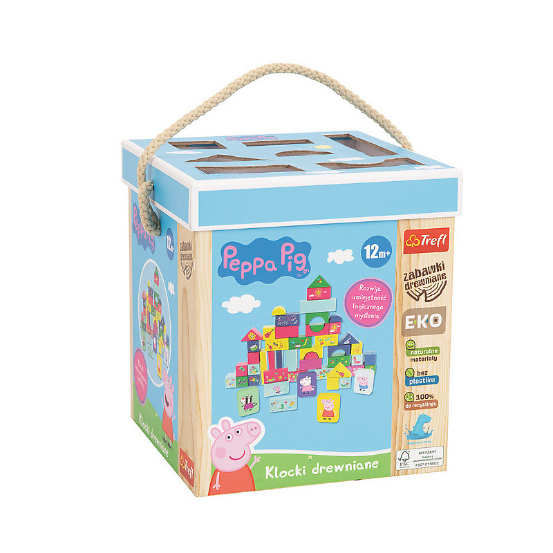 Edukacyjny zestaw 54 kolorowych klocków drewnianych na licencji Świnka Peppa.