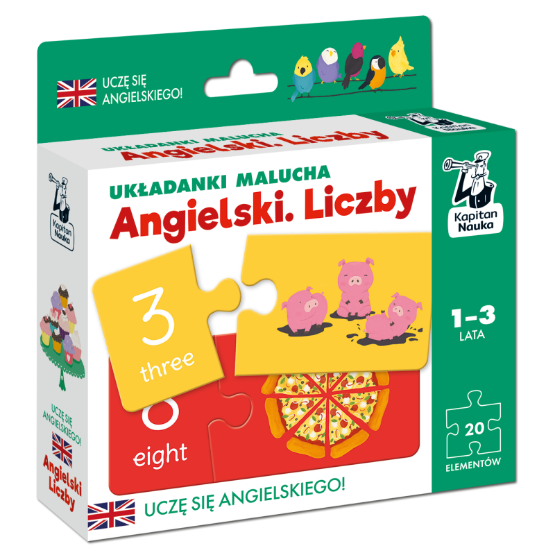 Przedstawiamy pakiet 20 dwudzielnych puzzli, dzięki którym maluchy uczą się liczyć w języku angielskim do 10. Każdy z dwuelementowych zestawów składa się z ilustracji zachęcającej dzieci do liczenia oraz liczby z podpisem w języku angielskim. Dziecko dopasowuje kolorowe rysunki obiektów do ich liczby. Dzięki nagraniom do pobrania (ze strony internetowej) osłuchuje się również z poprawną wymową, a także oswaja z zapisem angielskich liczb. Pakiet puzzli pozwala również na kreatywne zabawy dostosowane do możliwości i zainteresowań maluchów, zachęcając ich do dopasowywania elementów, które pasują kolorem, a potem do przeliczania elementów, pokazywania paluszkiem szczegółów ilustracji czy odpowiadania na pytania, np. Ile skarpetek wisi na sznurku? Na ile kawałków pokrojono pizzę? Czy widzisz na rysunku żółtą kredkę? Dzięki angażującej zabawie z puzzlami maluchy poznają angielskie liczby, a przy okazji trenują koordynację oko-ręka, spostrzegawczość i koncentrację.