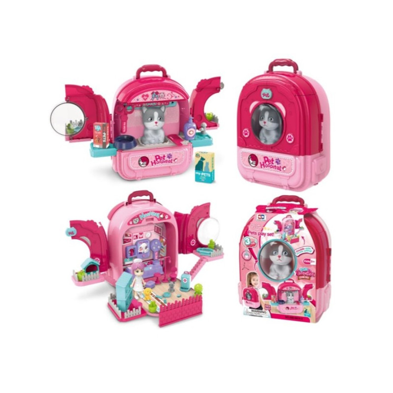 zestawy: plecak, salon piękności dla psów, przychodnia weterynaryjna, (w zestawie 3 zwierzątka i pani weterynarz + wystrój przychodni i salonu) wymiary: 26,3 x 15,2 x 30 cm
