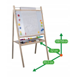 Wpływaj na rozwój zdolności artystycznych dziecka. Do pisania, rysowania, liczenia i kreatywnego tworzenia. Tablica wyposażona jest w gąbkę i 5 kolorów kredy. W zestawie jest również liczydło i rolka papieru. Są też magnetyczne literki. Rolkę papieru, umieszczoną na górze tablicy - można rozwijać. Jest to dodatkowa atrakcja dla małych twórców. Można na niej malować, pisać, rysować. Dodatkową zaletą tablicy jest półka pod tablicą do przechowywania wszystkich powyższych akcesoriów.