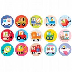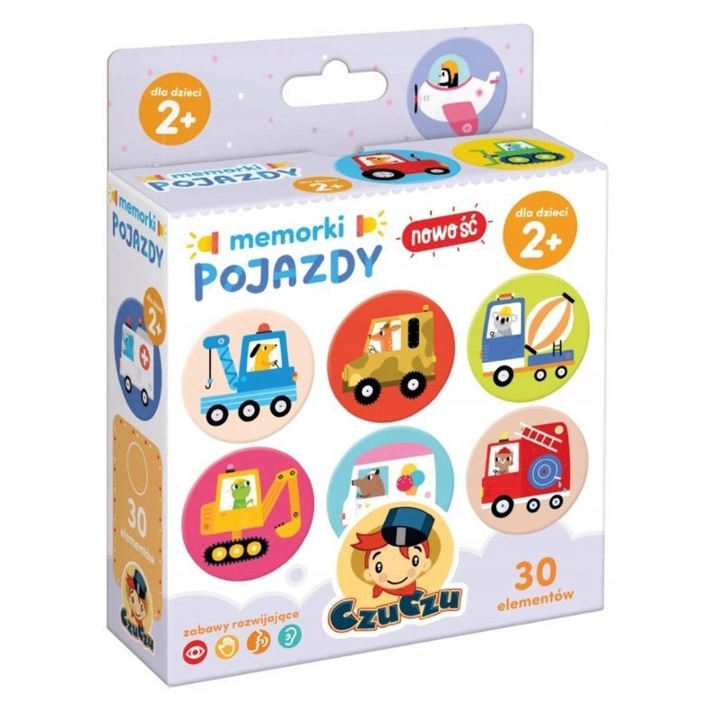 Gra pamięciowa dla najmłodszych 30 elementów, która polega na spostrzegawczości i dopasowywaniu elementów. Karty mają kształt koła, a obrazki przyciągają uwagę piękną kolorystyką i przyjaźnie wykonanymi wizerunkami pojazdów. Cała zabawa polega na tym, by wśród wszystkich odwróconych obrazkiem do dołu elementów odnaleźć dwa takie same. Doskonali małą motorykę, spostrzegawczość, koordynację ręka-oko. Wiek: 24m+.