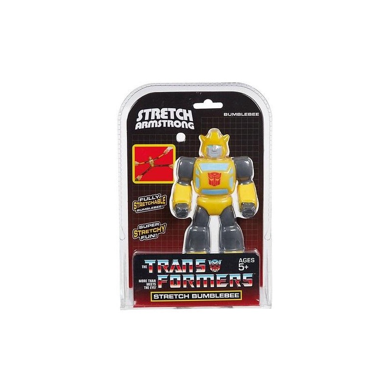 Bumblebee jest "młodszym bratem" bohaterskich Autobotów i maskotką, nieustannie starającą się udowodnić swoją wartość w oczach innych robotów - zwłaszcza swojego przywódcy, Optimusa Prime. Bumblebee jest jednym z najbardziej zaufanych poruczników Optimusa Prime. Chociaż nie jest najsilniejszym ani najpotężniejszym z Autobotów, Bumblebee z nawiązką nadrabia to pełnią szczęścia, determinacji i odwagi. Chętnie oddałby swoje życie, aby chronić innych i powstrzymać Decepticony. Baw się Bumblebee w wersji Stretch! Figurka jest super rozciągliwa i wytrzymała. Chwyć ją za dłonie i stopy i ciągnij! Zobacz, jak niesamowicie figurka się rozciąga! Figurka ma wysokość 16 cm i można ją rozciągnąć aż do 68 cm! Kiedy puścisz figurkę, używa swoich niesamowitych właściwości, aby powoli powrócić do swojego normalnego kształtu. Baw się świetnie tym super rozciągliwym i super elastycznym Bumblebee!
