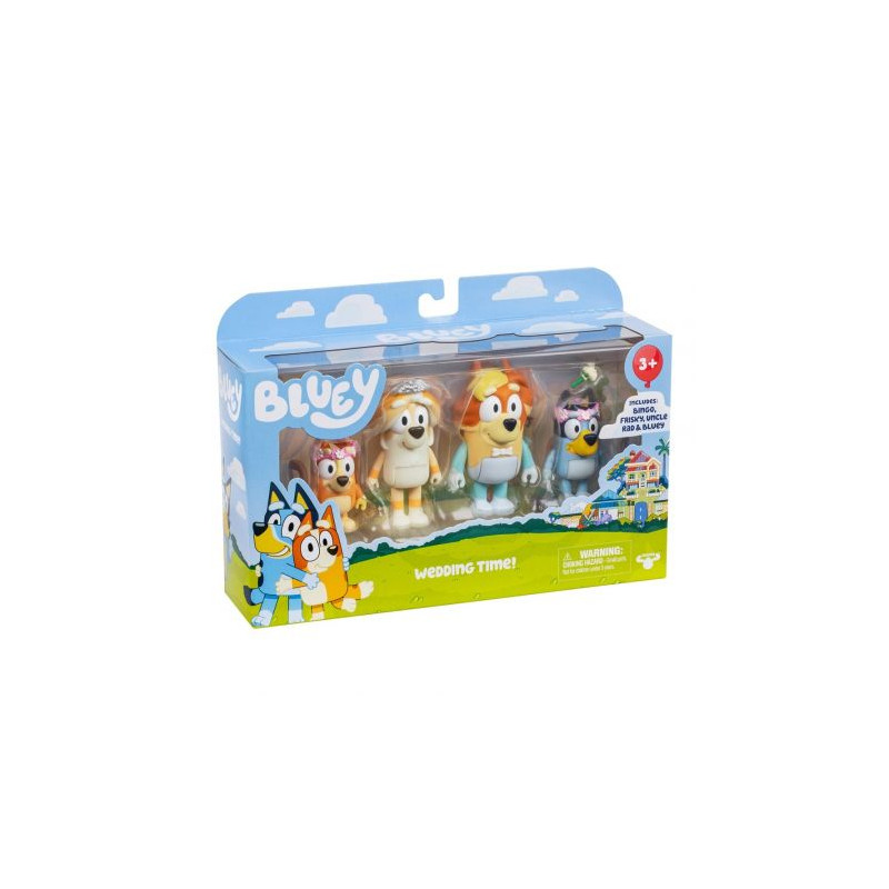 Zestaw dla każdego małego fana bajki Bluey. Ten ślubny zestaw zawiera Bluey, Bingo, Frisky i Wujka Rad - Chilli i siostrę Bluey.. Zabawka pozwoli na "dotknięcie" tej niesamowitej bajki w rzeczywistości.