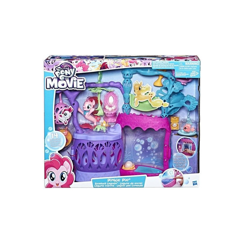 Pinkie Pie i Podwodny zamek z serii My Little Pony firmy Hasbro. Dwupiętrowy zamek wyposażony z imitacją basenu z czujnikiem dotykowym z efektami świetlnymi, wiszące siedzisko i huśtawkę, hamak, karuzelę. Po wlaniu wody uwolnisz bąbelki. Dodatkowo zestaw zawiera figurkę Pinkie Pie oraz akcesoria. Wiek 3+