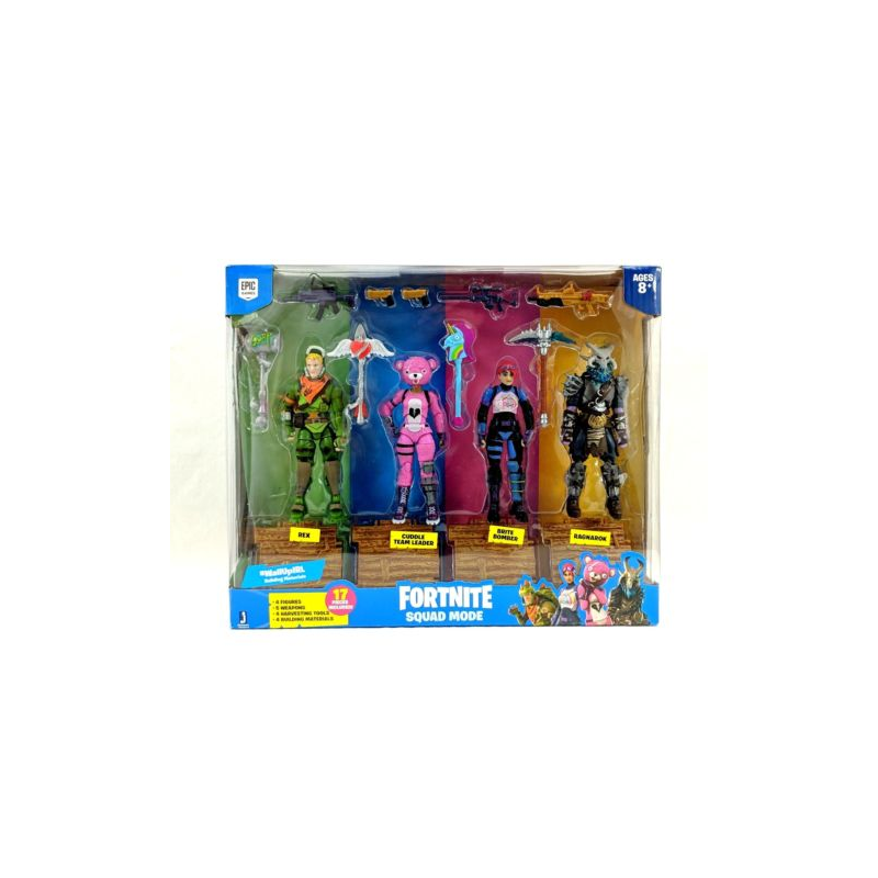 Zestaw 4 figurek + akcesoria z serii Fortnite firmy TM Toys. Fortnite to popularna gra komputerowa. Dołącz do jej fanów! Przenieś zabawę z wirtualnego świata do realnego i stwórz niepowtarzalną kolekcję figurek bohaterów z gry! Każda figura wykonana jest z dużą precyzją i dbałością o każdy szczegół ( wys. figurki 10 cm). Zestaw Squad Mode zawiera 17 elementów: 4 figurki Ragnarok, Rex, Cuddle Team Leader i Brite Bomber ,4 narzędzia do zbierania materiałów, 5 różnych broni, 4 drewniane materiały budowlane oraz przewodnik kolekcjonera. Zbieraj i łącz materiały budowlane, aby tworzyć struktury!