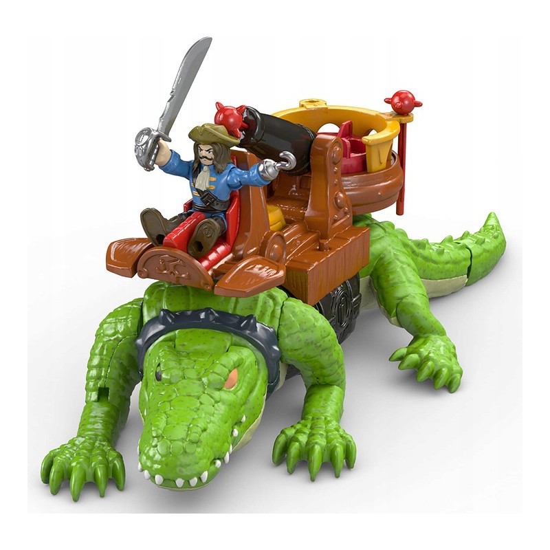 Kroczący krokodyl, który na swoim grzbiecie ma Pirata Haka. Dzięki zabawkom Imaginext dzieci mogą poczuć pirackie klimaty. Krokodyl ma ruchomą paszcze, która otwiera się przy popychaniu zwierzęcia po podłodze.