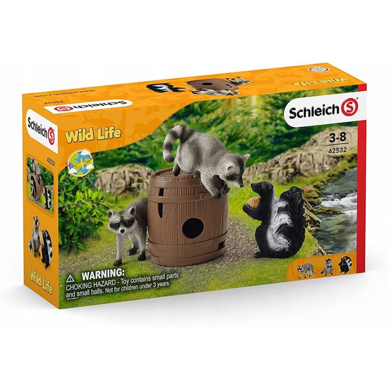 Skunks znalazł piękny orzech, który postanowił szybciutko umieścić w beczce, by był tam bezpieczny. O rety! Orzech wrzucony, a w środku już czeka szop i trzyma go w łapkach. Czy skunksowi uda się odzyskać smakołyk? Fajny zestaw dla dzieci, który rozwija wyobraźnię. Figurki Schleich odwzorowane są z dbałością o szczegóły, służą do zabawy edukacyjnej. W zestawie: 2 x szop pracz (w różnych pozach), 1 x skunks, 1 x beczka, 1 x orzech.