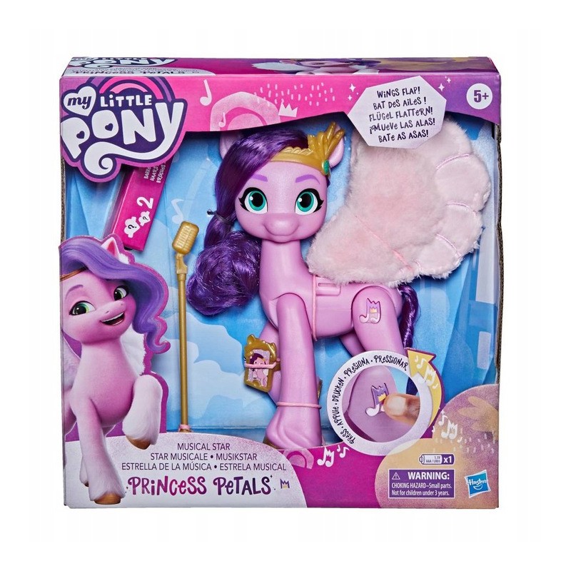 Figurka MLP Star Princess ma miękkie fioletowe włosy, które można czesać i stylizować. Śpiewająca Księżniczka Petals śpiewa część swojego przeboju z filmu „Glowing Up” wystarczy nacisnąć nutkę na jej nodze, aby zaczęła śpiewać. Petals ma także piękne, puszyste, różowe skrzydła gdy ściśniesz razem jej tylne nogi będą trzepotały w górę i w dół. Wyobraź sobie, że księżniczka Petals leci, gdy występuje dla swoich fanów. W zestawie znajdziemy także 5 akcesoriów, w tym statyw z mikrofonem, telefon komórkowy, tiarę i 2 spinki do włosów. Idealna dla każdej miłośniczki MLP. Rozwinie poczucie opiekuńczości, wrażliwości o wyobraźnię. Wiek 5+.