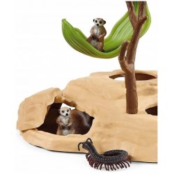 Trzy surykatki przeżywają niezliczone przygody w nowym kopcu surykatek. Małe, zuchwałe stworzenia mogą kołysać się na huśtawce, zjeżdżać po kopcu lub bawić się w chowanego wokół kopca surykatki. Czy w melonie chowa się surykatka? Po tak energicznej zabawie czas na drzemkę na huśtawce liści. Figurki Schleich rozwijają wyobraźnię, kreatywność. Wiek 3+.