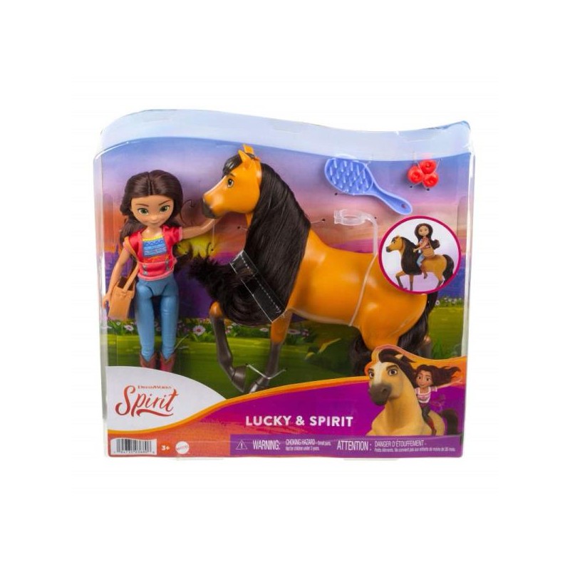 Doświadcz przyjaźni, odwagi i przygody z postacią z kreskówek Spirit z DreamWorks Spirit. Lalka Lucy mierzy około 18cm, a jej ukochany koń Spirit ma około 20cm wysokości. Lalka Lucky jest ubrana w formowane dżinsy, buty mamy, torebkę oraz śliczny materiałowy top. Lalka ma 7 ruchomych przegubów i jest gotowa do zabawy w pozach. Spirit ma ruchomą głowę, która umożliwia pozowanie, miękką grzywę do układania zabawnych włosów i zabawną pozę. Użyj grzebienia, aby ułożyć włosy Lucky oraz grzywę i ogon Spirita. Wiek 3+.