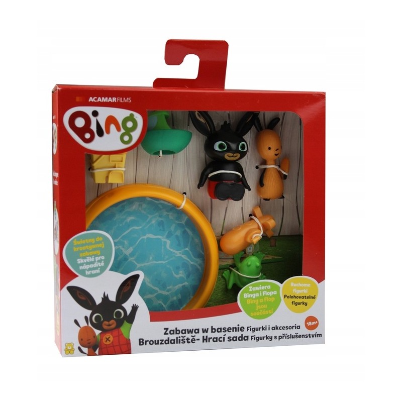 Oprócz dwóch uroczych figurek bohaterów kultowej bajki zestaw zawiera też różne akcesoria, jak basenik wykonany z twardego plastiku, do którego można wlać wodę, czy kolekcja zabawek Binga i Flopa, a w niej łódeczka, łódź podwodna i wiaderko do budowania zamków z piasku. Jest tu nawet mała, psotna żabka. Głowa Binga obraca się, a jego nogi zginają się, więc można je ustawiać w dowolnej pozycji. 7 elementów, w tym 2 figurki. Wiek 18m+.