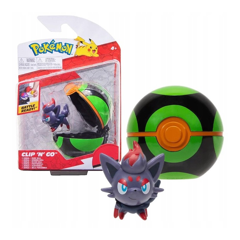 Zestaw Pokemon Clip N Go Figurka Zorua + Pokeball. Kula otwiera się i zamyka oraz z łatwością mieści figurki do ok. 5,5cm wysokości lub szerokości. Figurka przedstawia Pokemona Zorua. Wiek 4+.