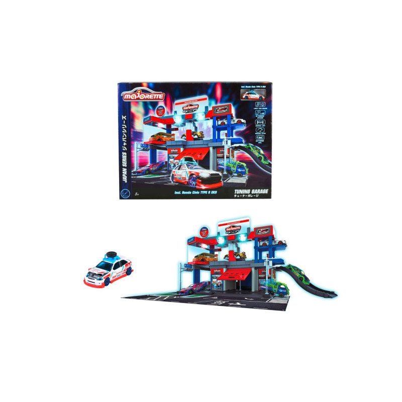 Na niższym poziomie znajduje się kilka krytych miejsc parkingowych wraz z manualnym, ruchomym podnośnikiem. Na ściankach między nimi widać naklejki imitujące pobyt innych autek w garażu. Natomiast na wyższym poziomie, na który można dostać się za pomocą stromego wjazdu , można dostrzec podnośnik do tuningu oraz ręczną windę dla samochodów . Po lewej stronie zamontowano plastik imitujący przezroczyste szyby aby każdy mógł podziwiać ulepszone pojazdy.