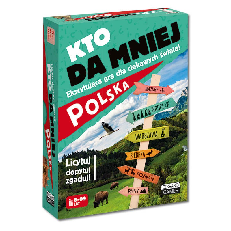 W którym polskim rezerwacie spotkasz majestatyczne żubry, rysie, bobry, łosie i jelenie, a także wilki i rzadko spotykane żółwie błotne? Który polski zabytek to tak naprawdę średniowieczna galeria handlowa, a w jej murach handlowano przede wszystkim suknem? Czy wiesz, gdzie wylądował słynny Spodek, czyli sala koncertowa przypominająca UFO? Ile pytań potrzebujesz, żeby wpaść na właściwą odpowiedź? Kto da mniej. Polska to emocjonująca gra karciana dla całej rodziny. Sprawdzisz w niej swoją wiedzę na temat polskiej przyrody, historii, geografii oraz kultury. Podczas rozgrywki liczy się spryt, odwaga i umiejętność wyciągania wniosków. Gracze licytują między sobą ilość podpowiedzi, a rundę wygrywa osoba, która zalicytuje najniżej i prawidłowo odgadnie jaki polski region, miasto lub rzeka ukrywa się na kartach. Licytujcie jak najniżej, pytajcie, dedukujcie i zgadujcie! Grać można w parach lub w grupie do 5 osób. Rozgrywka zajmuje ok. 15 minut w zależności od wieku graczy i wybranego wariantu gry. Kto odgadnie wszystkie polskie miasta, regiony oraz zabytki i zostanie mistrzem licytacji?