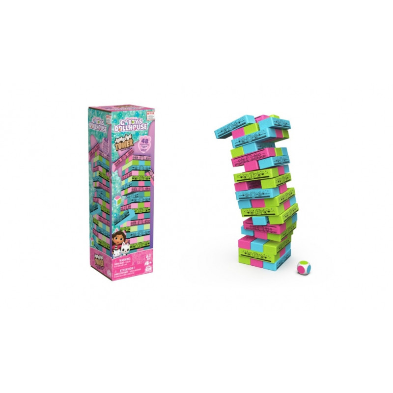 KOLOROWE DREWNIANE KLOCKI: Ta gra dla dzieci zawiera 48 drewnianych klocków w kolorze niebieskim, różowym i zielonym z ikonami Kociego Domku Gabi. Rzuć kością, aby ustalić kolor i wyjmij klocek tego koloru z wieży.