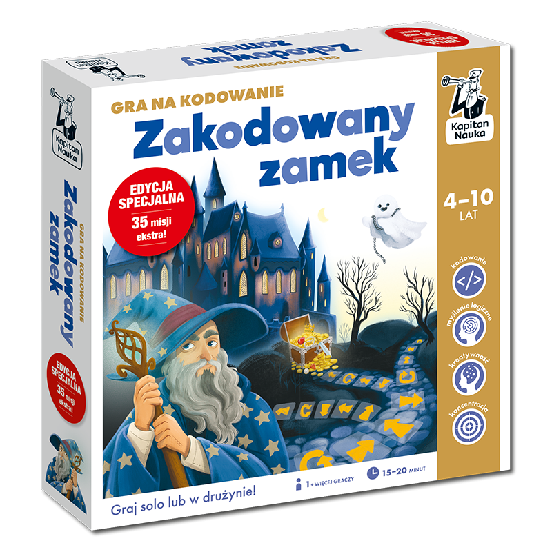 Gra na kodowanie. Edycja specjalna – to rozszerzona wersja bestsellerowej gry Kapitana Nauki Zakodowany Zamek. Gra na kodowanie (ponad 30 000 sprzedanych egzemplarzy!). Zawodnicy – występujący tutaj w roli czarodzieja – muszą współpracować, aby dotrzeć do skarbów i obronić warownię przed zmierzającym na szczyt zamkowej wieży duchem. Torują drogę czarodziejowi i układają specjalne sekwencje kart, co pozwala na naukę podstaw kodowania: tworzenia zrozumiałych komunikatów i algorytmów. Ponadto, gra wspiera rozwój takich umiejętności, jak: myślenie logiczne, koncentracja, kreatywność. W grę można grać zarówno solo, jak i w drużynie.