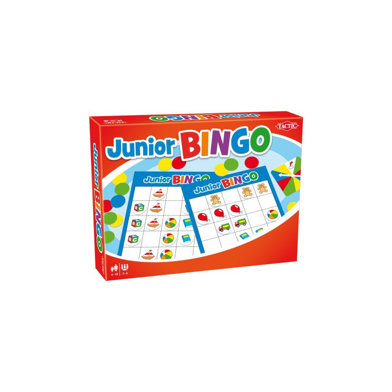 Junior Bingo firmy Tactic. Zakręć ruletką i układaj na planszy żetony. Jeśli jako pierwszy ułożysz 5 jednakowych żetonów w rzędzie wygrasz. Zestaw zawiera 6 plansz, ruletkę, 100 żetonów i instrukcję. Ilość graczy 1-4 Wiek 4+