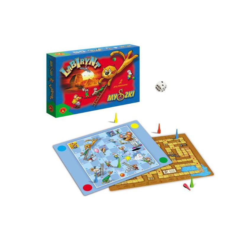 Myszki, labirynt gry firmy Alexander. Zestaw dwóch gier planszowych dla najmłodszych. Aby wygrać należy jak najszybciej dotrzeć do mety. Zestaw składa się z gier: - Myszki - Labirynt.