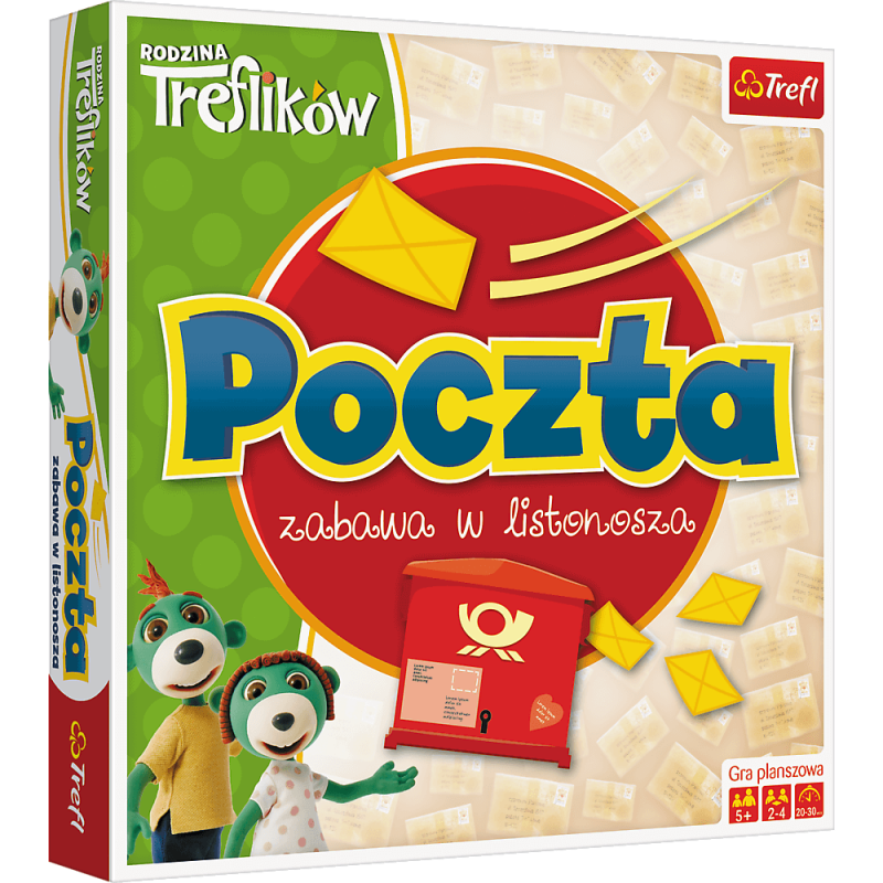 Rodzina Treflików Poczta- zabawa w listonosza gra planszowa firmy Trefl. Gra planszowa, w której zadaniem jest dostarczenie listów i paczek postaciom ze świata Treflików. Wykonaj zadania z bohaterami popularnej bajki. Liczba graczy 2-4Wiek 5+