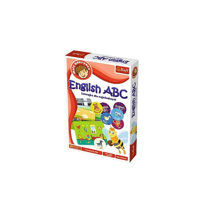 Gra English ABC firmy Trefl. Gra edukacyjna z serii Mały odkrywca. Gra polega na dopasowywaniu słów angielskich do polskich. Ucz się poprzez zabawę. Zestaw składa się z 4 plansz tematycznych oraz 24 okrągłych kartoników. Ilość graczy 1-4 Wiek 3+