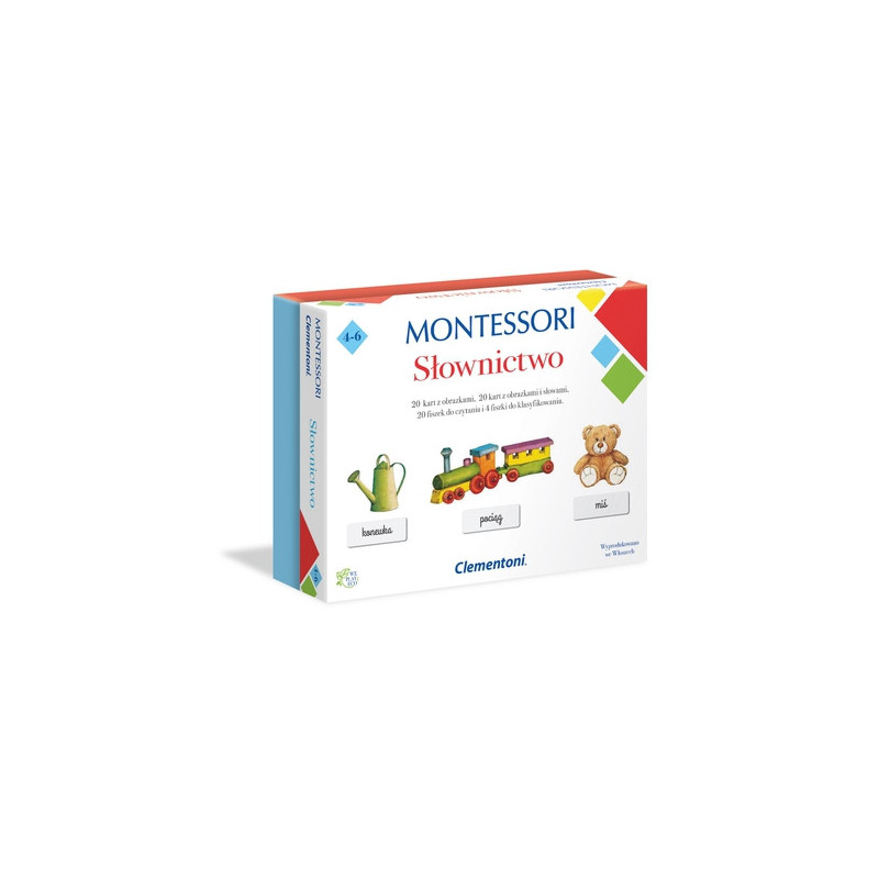 Montessori Słownictwo firmy Clementoni. Edukacyjna gra inspirowana metodą Montessori. Gra polega na dopasowywaniu karty do zdjęć. Stymuluje w naturalny sposób rozwój słownictwa. Wiek 4+