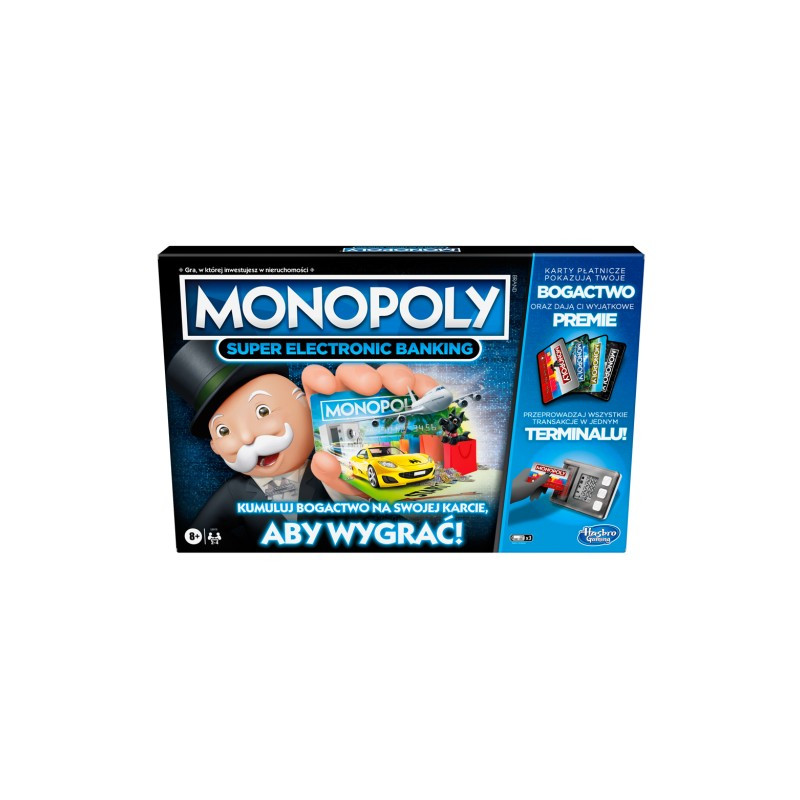 Gra Monopoly Super Electronic Banking Wersja Polska E8978. Wybierz kartę płatniczą, wybierz premię! Karty płatnicze pokazują Twoje bogactwo i zapewniają Ci wyjątkowe premie. Poruszaj się po planszy, kupując tyle nieruchomości, ile tylko dasz radę, a także pobierając czynsz i premie. Gra kończy się, gdy zostaną zakupione wszystkie nieruchomości. Wygrywa gracz z największą ilością pieniędzy! Gra jest szybka i przyjemna dzięki temu, że wszystkie transakcje odbywają się bezgotówkowo w jednym terminalu.